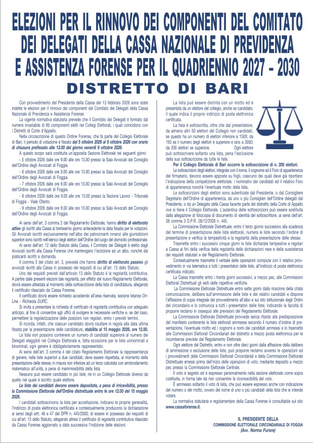 Cassa Forense – Elezioni per il rinnovo dei componenti del comitato dei Delegati per il quadriennio 2027-2030 – Distretto di Bari