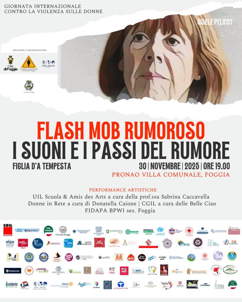 Per celebrare la “Giornata Internazionale contro la violenza sulle Donne” in data 30.11.2025, alle ore 19, Pronao Villa Comunale di Foggia, si terra’ il Flash Mob Rumoroso ” I SUONI ED I PASSI DEL RUMORE”.